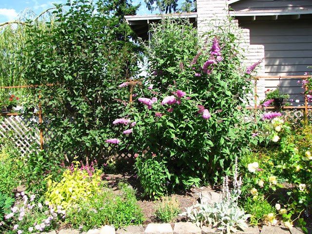 A little of what goes on under the Butterfly Bush. I found the Lupine seedling earlier this year and moved it to this part of the garden. I'm surprised to see blooms on it now, and really happy they are purple. Scabiosa, Agastache 'Golden Jubilee', Penstemon 'Catherine de la Mar' (lavender flowers) and Penstemon 'Red Rocks' all blooming together.